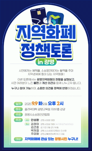 [NWS¹æ¼Û=Çѽ¸ñ ±âÀÚ]±¤¸íÁö¿ªÈÆóÀÇ ÇöȲ°ú °³¼± ¹æÇâÀ» µÎ°í ½Ã¹Î°ú ¼Ò»ó°øÀÎÀÌ ÇÔ²² ¸Ó¸®¸¦ ¸Â´ë´Â Á¤Ã¥Åä·Ðȸ°¡ ¿¸°´Ù. ¿À´Â 9¿ù 9ÀÏ ¿ÀÈÄ 2½Ã, Æú¸®ÅØ´ëÇÐ ±¤¸í±³À°¿ø ÁöÇÏ1Ãþ °´ç¿¡¼ °³ÃֵǴ 'Áö¿ªÈÆó Á¤Ã¥Åä·Ð in ±¤¸í'ÀÌ ±× ¹«´ë´Ù.