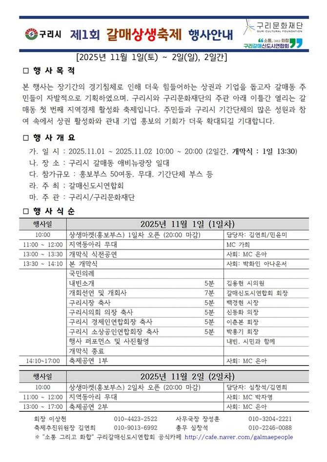 À̹ø ÃàÁ¦´Â °¥¸Å½Åµµ½Ã¿¬ÇÕȸ°¡ ÁÖÃÖÇÏ°í ±¸¸®½Ã¿Í ±¸¸®¹®ÈÀç´ÜÀÌ ÁÖ°üÇϸç, Àå±âÀûÀÎ °æ±âħü·Î ¾î·Á¿òÀ» °Þ°í ÀÖ´Â ¼Ò»ó°øÀΰú ±â¾÷À» µ½±â À§ÇØ ÁֹεéÀÌ ÀÚ¹ßÀûÀ¸·Î ±âȹÇÑ Áö¿ª°æÁ¦ Ȱ¼ºÈ Çà»ç´Ù. ±¸¸®½Ã ±â°£´Üü¸¦ ºñ·ÔÇÑ ½Ã¹Î, »óÀÎ, ±â¾÷ÀÌ ÇÔ²² Âü¿©ÇÏ´Â ¡®»ó»ýÀÇ ÃàÁ¦ÀÌÀÚ Áö¿ª °øµ¿Ã¼ÀÇ ÃàÁ¦¡¯·Î ±âȹµÇ¾ú´Ù.