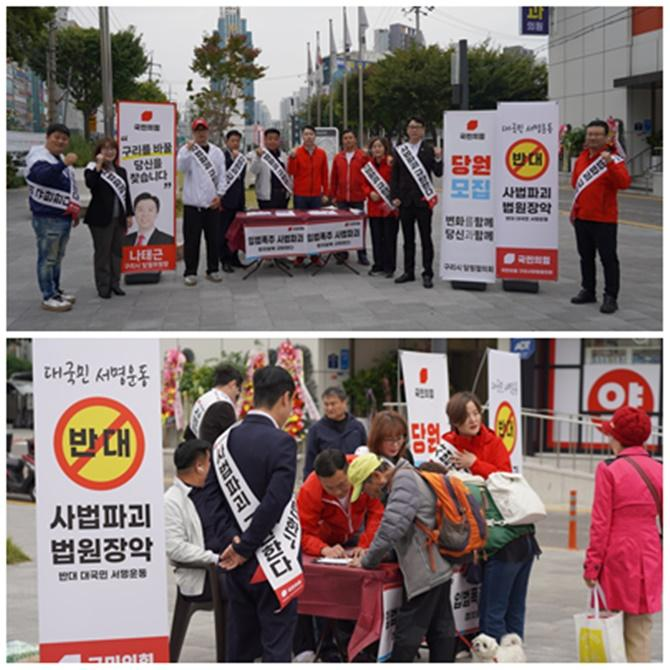 À̳¯ Çà»ç¿¡¼ ±¸¸®½Ã ´çÇù ´ç¿øµéÀº ¡°¹æÅº ±¹È¸ ³Ñ¾î ¹æÅº »ç¹ýºÎ³Ä¡±, ¡°ÀÌÀç¸íÇ¥ »ç¹ýÆÄ±«, ±¹¹ÎÀÌ ½ÉÆÇÇÑ´Ù¡± µîÀÇ ¹®±¸°¡ ÀûÈù ÇÇÄÏÀ» µé°í °Å¸® ½Ã¹Îµé¿¡°Ô »ç¹ýºÎ Àå¾Ç ½ÃµµÀÇ ºÎ´çÇÔÀ» ¾Ë¸®¸ç ¼¸í µ¿Âü°ú ±¹¹ÎÀÇÈû ´ç¿ø °¡ÀÔÀ» È£¼ÒÇß´Ù. ÇöÀå¿¡´Â ÃâÅð±Ù ½Ã¹Î°ú »ó°¡ ¹æ¹®°´µéÀÇ ¹ß±æÀÌ À̾îÁ³°í, ¸¹Àº ½Ã¹ÎµéÀÌ Áï¼®¿¡¼ ´ç¿øÀ¸·Î °¡ÀÔÇßÀ¸¸ç ¼¸í´ë¿¡µµ Âü¿© Çà·ÄÀÌ ²÷ÀÌÁö ¾Ê¾Ò´Ù.
