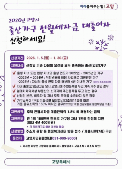 [NWS¹æ¼Û=ÇãÀº¼ ±âÀÚ]°í¾çƯ·Ê½Ã´Â ¹«ÁÖÅà Ãâ»ê°¡±¸ÀÇ Áְźñ ºÎ´ãÀ» ´ú¾îÁÖ±â À§ÇØ ¡®2026³â °í¾ç½Ã Ãâ»ê°¡±¸ Àü¿ù¼¼ÀÚ±Ý ´ëÃâÀÌÀÚ Áö¿ø »ç¾÷¡¯ ½ÅûÀ» 1¿ù 30ÀϱîÁö ¹Þ´Â´Ù°í ¹àÇû´Ù.
