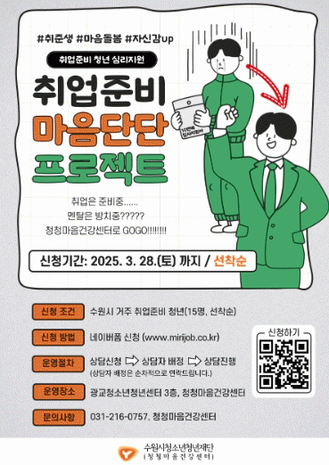 [NWS¹æ¼Û=Çѽ¸ñ ±âÀÚ] ¼ö¿ø½Ãû¼Ò³âû³âÀç´Ü(ÀÌ»çÀå ÃÖÁ¾Áø) ûû¸¶À½°Ç°¼¾ÅÍ´Â Ãë¾÷ Áغñ·Î ÀÎÇÑ ½É¸®Àû ¾Ð¹Ú°¨°ú °æÁ¦Àû ºÎ´ãÀ» µ¿½Ã¿¡ °Þ´Â û³âµéÀ» À§ÇØ 2026. Ãë¾÷Áغñ û³â ½É¸®Áö¿ø'Ãë¾÷Áغñ ¸¶À½´Ü´Ü ÇÁ·ÎÁ§Æ®'Âü¿©ÀÚ¸¦ ¸ðÁýÇÑ´Ù°í ¹àÇû´Ù.