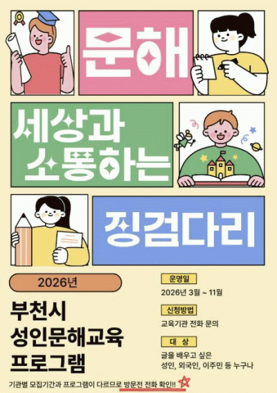 [NWS¹æ¼Û=Çѽ¸ñ ±âÀÚ]ºÎõ½Ã´Â 3¿ùºÎÅÍ 11¿ù±îÁö ºÎõ½Ã¿ø¹Ì³ëÀκ¹Áö°ü µî °ü³» 12°³ ±â°ü¿¡¼ ¹è¿òÀÇ ±âȸ¸¦ ÃæºÐÈ÷ ´©¸®Áö ¸øÇÑ ½Ã¹ÎÀ» ´ë»óÀ¸·Î ¼ºÀι®Çر³À° ÇÁ·Î±×·¥ ¡®¹®ÇØ, ¼¼»ó°ú ¼ÒÅëÇϴ ¡°Ë´Ù¸®¡¯¸¦ Æ÷ÇÔÇÑ ÃÑ 33°³ ±³À°°úÁ¤À» ¿î¿µÇÑ´Ù.