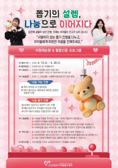 À̹ø Ȱµ¿Àº °¡Á¤¿¡¼ »ç¿ëÇÏÁö ¾Ê´Â ÀÎÇüÀ» ¼ö°ÅÇØ Àç¼øÈ¯ÇÑ µÚ ¾Æµ¿½Ã¼³¿¡ Àü´ÞÇÏ´Â ÀÚ¿ø¼øÈ¯Çü ÇÁ·Î±×·¥À̸ç, Âü¿©ÀÚ´Â ³ª´® ±âÁØ¿¡ ¸Â´Â ÀÎÇüÀ» ÁغñÇØ ¼¾Å͸¦ ¹æ¹®Çϸé Á¢¼ö°¡ °¡´ÉÇÏ´Ù. À̸¦ °è±â·Î ÀÚ¿øÀç¼øÈ¯°ú Ȱµ¿ÀÎÁõÀ» ¿¬°èÇÏ¿© ÀÚ¿ø¼øÈ¯ Àνİú ³ª´® ¹®È¸¦ È®»êÇϰí Áö¼Ó °¡´ÉÇÑ ÀÚ¿øºÀ»ç ±â¹ÝÀ» ¸¶·ÃÇϰíÀÚ ±âȹµÆ´Ù.