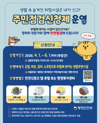 ¡®ÁÖ¹ÎÁ¡°Ë½ÅûÁ¦¡¯´Â ½Ã¹ÎµéÀÌ Æò¼Ò ¾ÈÀüÀÌ ¿ì·ÁµÆ´ø °ø°ø ¹× ¹Î°£ ½Ã¼³¹°¿¡ ´ëÇØ Á¡°ËÀ» ½ÅûÇϸé, Àü¹®°¡¿Í °ø¹«¿øÀÌ ÇÕµ¿À¸·Î ÇöÀåÀ» ¹æ¹®ÇÏ¿© À§Çè ¿äÀÎÀ» ²Ä²ÄÈ÷ »ìÇÇ°í °á°ú¸¦ ¾Ë·ÁÁÖ´Â Á¦µµ´Ù. ÇàÁ¤±â°ü ÁÖµµÀÇ Á¡°Ë¿¡¼ ¹þ¾î³ª ¾ÈÀü°ü¸® »ç°¢Áö´ë¸¦ ÇØ¼ÒÇϱâ À§ÇØ ¸¶·ÃµÆ´Ù.