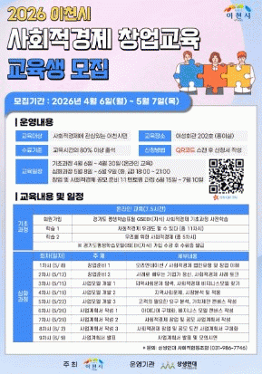 »çȸÀû°æÁ¦ â¾÷±³À°Àº ¡â±âº»°úÁ¤ ¡â½ÉȰúÁ¤ ¡âÀü¹®°úÁ¤À¸·Î ´Ü°èº°·Î ÁøÇàµÈ´Ù. ±âº»°úÁ¤Àº ¿Â¶óÀα³À°À¸·Î °æ±âµµÆò»ýÇнÀÆ÷Åп¡¼ ÁøÇàÇϰí ÀÖ´Â ¡®»çȸÀû°æÁ¦ ¿ì¸®µµ ÇÒ ¼ö ÀÖ´Ù(11Â÷½Ã)¡¯, ¡®¿ì¸®¸¦ À§ÇÑ °¡Ä¡ »çȸÀû°æÁ¦(5Â÷½Ã)¡¯ °úÁ¤À» À̼öÇÏ¸é µÈ´Ù. ½ÉÈ °úÁ¤Àº ÁýÇÕ±³À°À¸·Î ÁøÇàµÇ¸ç, 5¿ù 8ÀϺÎÅÍ 6¿ù 9ÀϱîÁö ¸ÅÁÖ È¡¤±Ý¿äÀÏ 3½Ã°£¾¿ ÃÑ 9ȸ °úÁ¤À¸·Î ÀÌõ½Ãû ¿©¼ºÈ¸°ü 202È£(È«À̽Ç)¿¡¼ ¿î¿µÇÑ´Ù.