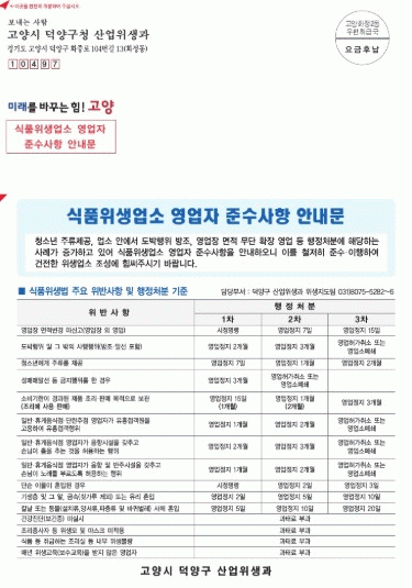 [NWS¹æ¼Û=Çѽ¸ñ ±âÀÚ]°í¾çƯ·Ê½Ã ´ö¾ç±¸´Â ÀϹÝÀ½½ÄÁ¡, ÈÞ°ÔÀ½½ÄÁ¡, Á¦°úÁ¡ µî ½ÄǰÀ§»ý¾÷¼Ò 5,784°³¼Ò¸¦ ´ë»óÀ¸·Î ÀÚÀ² À§»ý ¼öÁØ Çâ»ó°ú ½ÄÁßµ¶ ¿¹¹æÀ» À§ÇØ ¿µ¾÷ÀÚ Áؼö»çÇ× ¾È³»¹®À» 4¿ù 15ÀϺÎÅÍ 17ÀϱîÁö °¢ ¾÷¼Ò·Î ¹èºÎÇÒ ¿¹Á¤ÀÌ´Ù.